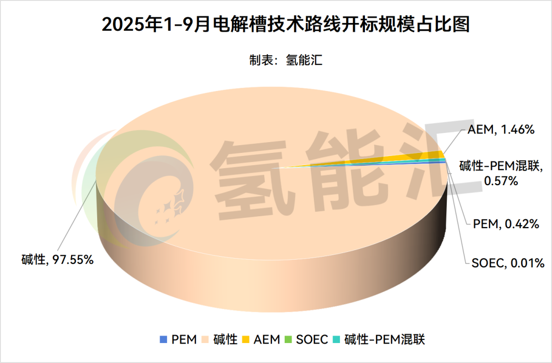 氢能汇通过梳理2025年1-9月氢能中标、签约项目技术路线,包括碱性、AEM、PEM、SOEC、碱性-PEM混联5种技术路线。
