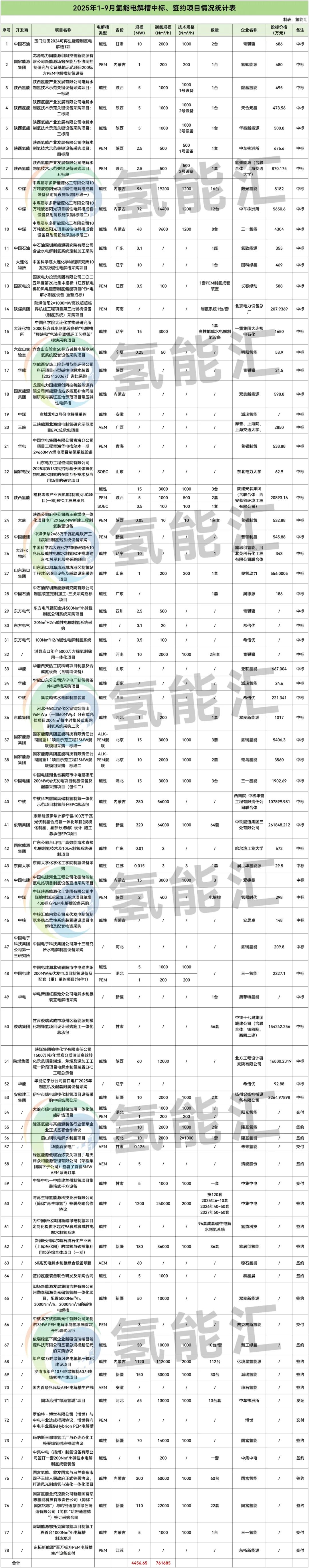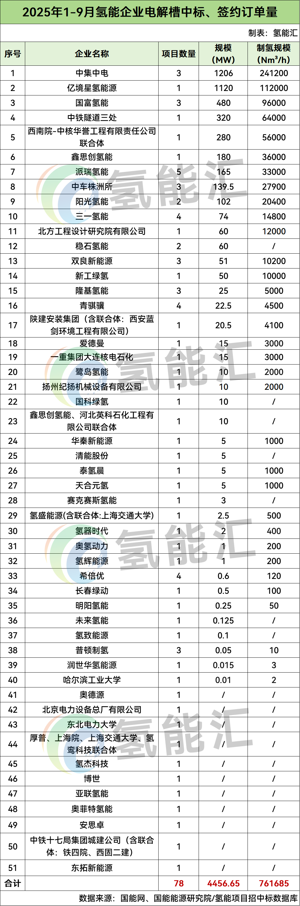 氢能汇根据公开信息不完全统计,2025年1-9月,共有78个氢能电解槽中标、签约项目,规模累计4456.65MW,制氢规模累计761685Nm³/h。
