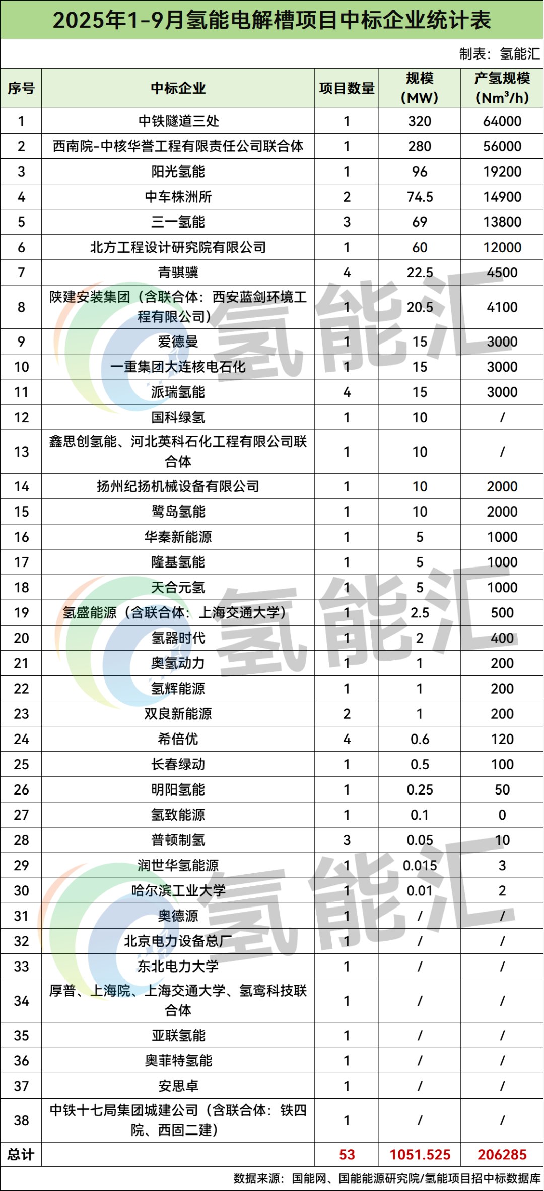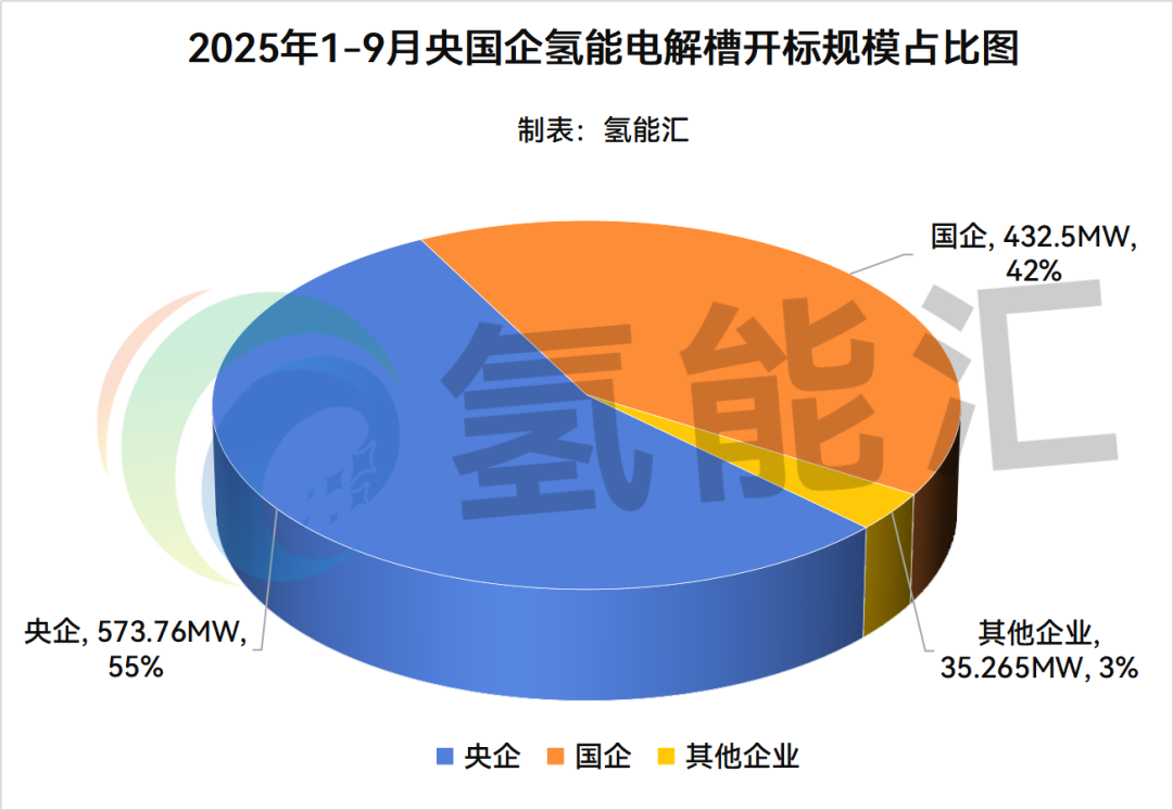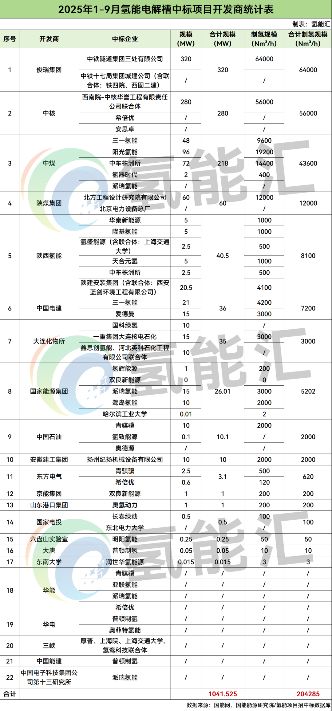 氢能汇通过氢能项目数据库显示,2025年1-9月共有22家开发商发布电解槽开标结果,大部分项目由央企占据。