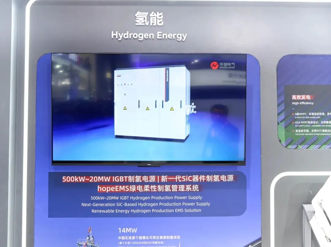 氢能展区内,禾望电气积极布局氢能赛道,推出了500kW~20MW IGBT制氢电源、500kW~33MW晶闸管制氢电源以及新一代SiC制氢电源,目前已实现超100MW制氢电源实例应用。结合公司风光储电能变换与控制产品,以及hopeEMS绿电柔性制氢管理系统,提供风光储并/离网制氢电力系统一体化解决方案。